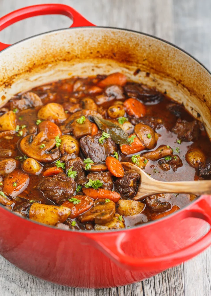 For a healthier stew, you can tilt the pot after it comes out of the oven to allow the liquid to pool to one side, then skim off any excess fat.